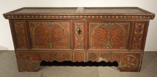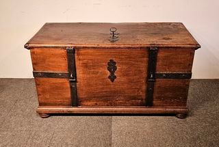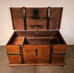 Originaler Schliessmechanismus mit schauseitigem Hauptschloss und zwei Deckelschlösser sowie Eisenriegelverstärkung.